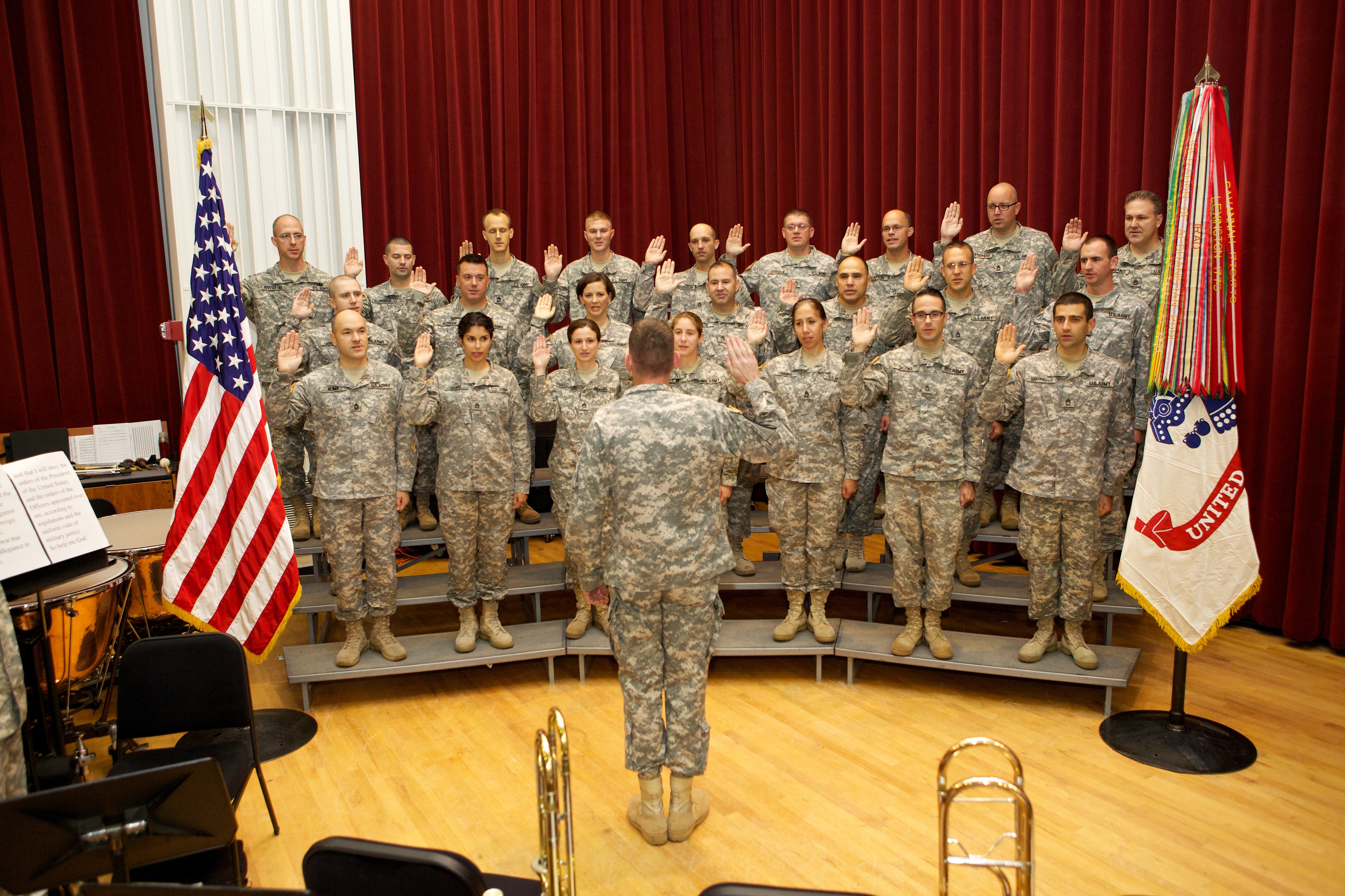 Brig. Gen. Gary J. Volesky, chief of public affairs, Office of the Secretary of the Army, re-enlists 23 Soldiers of the U.S. Army Field Band during a mass re-enlistment ceremony on Oct. 2 at the field band's rehearsal hall on Fort Meade. Members of t...