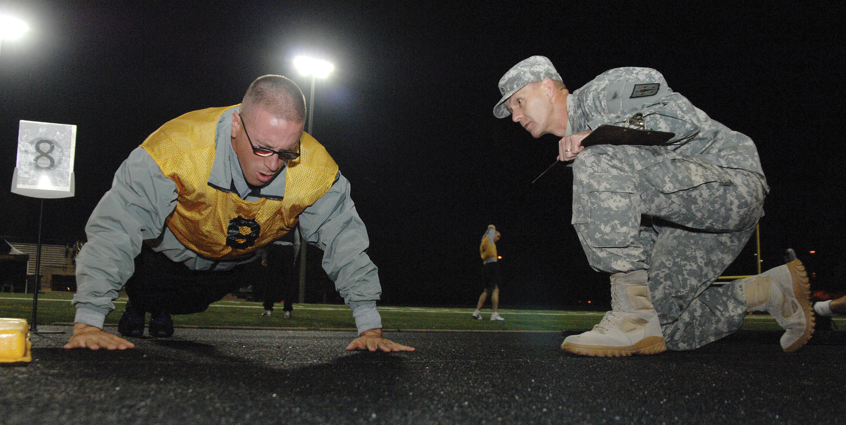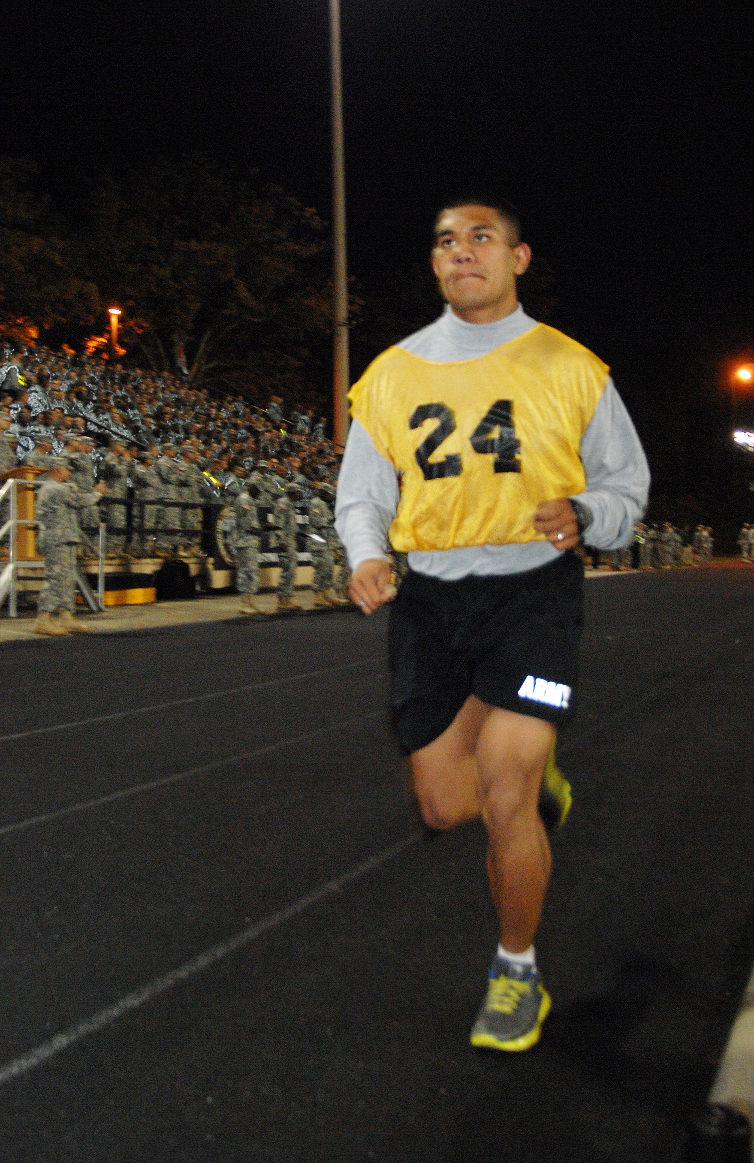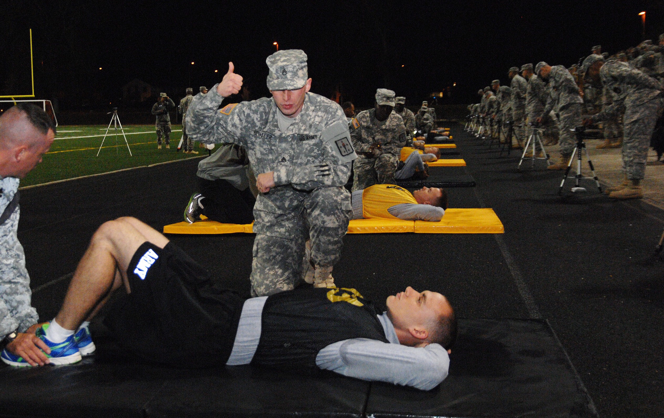 FORT LEE, Va. (Oct. 17, 2012) - Participants of the 2012 U.S. Army Best Warrior Competition push forward at a steady pace during the Army Physical Fitness Test here Tuesday morning at Williams Stadium. The APFT is one of several challenging events th...