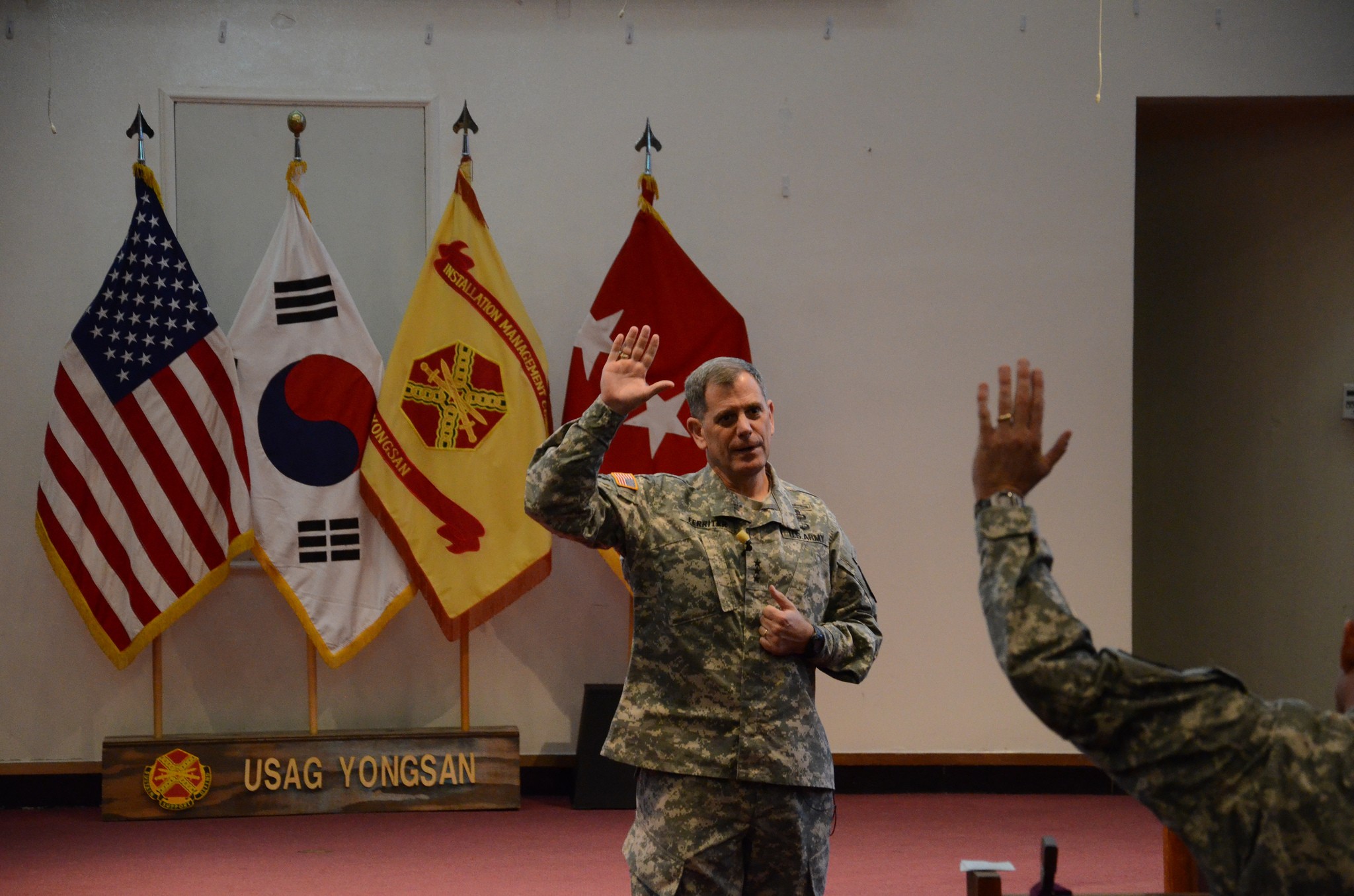 Throughout the week, Ferriter scheduled lunches with Soldiers, visited numerous IMCOM facilities and met with the IMCOM workforce whenever possible. He also participated in such events as a ribbon-cutting ceremony at the Commiskey Community Activity Center in Yongsan, the Thanksgiving Day meal at Camp Red Cloud and a Soldier combative training session at Camp Humphreys.