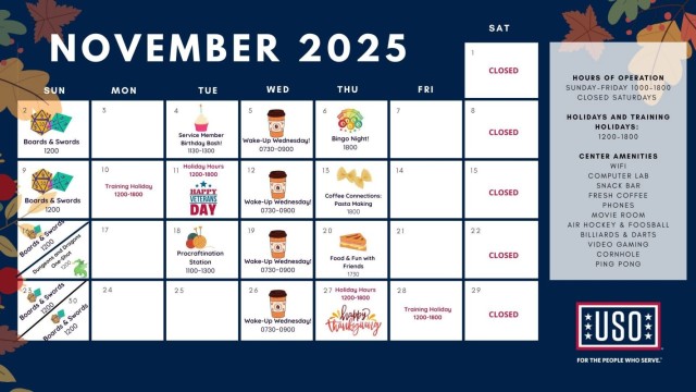 The Child Development and School Age Center, Bldg. 9028, will be closed November 24-28, 2025, to allow for repair and resurfacing of floors.