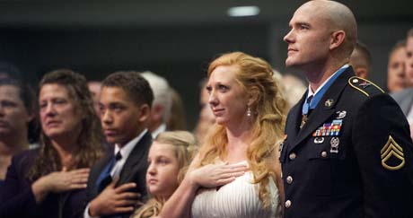 Of these men, one Soldier's gallantry stood out. Without regard to his own safety, Spc. Ty Michael Carter proved himself time and time again. He resupplied ammunition to fighting positions, provided first aid to a battle buddy, killed enemy troops and valiantly risked his own life to save a fellow Soldier who was injured and pinned down by overwhelming enemy fire. He did all this while under heavy small arms and indirect fire that lasted more than six hours. Carter's actions of risking his life above and beyond the call of duty, while engaged in combat against the enemies of the United States, were heroic, make him a most deserving recipient of the Medal of Honor for his fearless and decisive actions that day.
