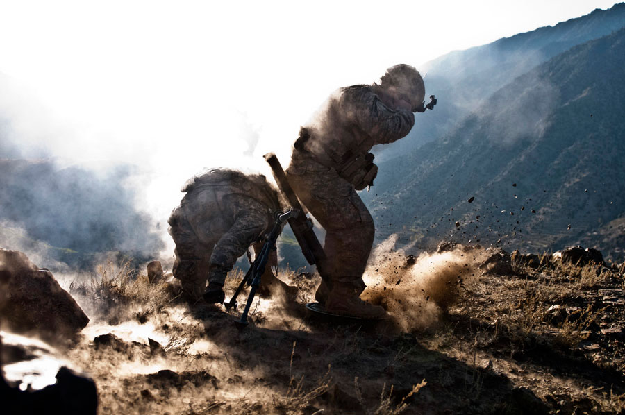 A mortar man fires mortars - Download Hi-Res photoSgt. Richard A. Darvial (kneeling), a combat medic , takes cover while Spc. Corey C. Canterbury, a mortar man, fires mortars from a mountain top overlooking the Ganjgal Valley in eastern Afghanistan's Kunar Province, Dec. 11, 2010. Both Soldiers are assigned to Bayonet Company, 2nd Battalion, 327th Infantry Regiment, Task Force No Slack, and were supporting Operation Eagle Claw II.