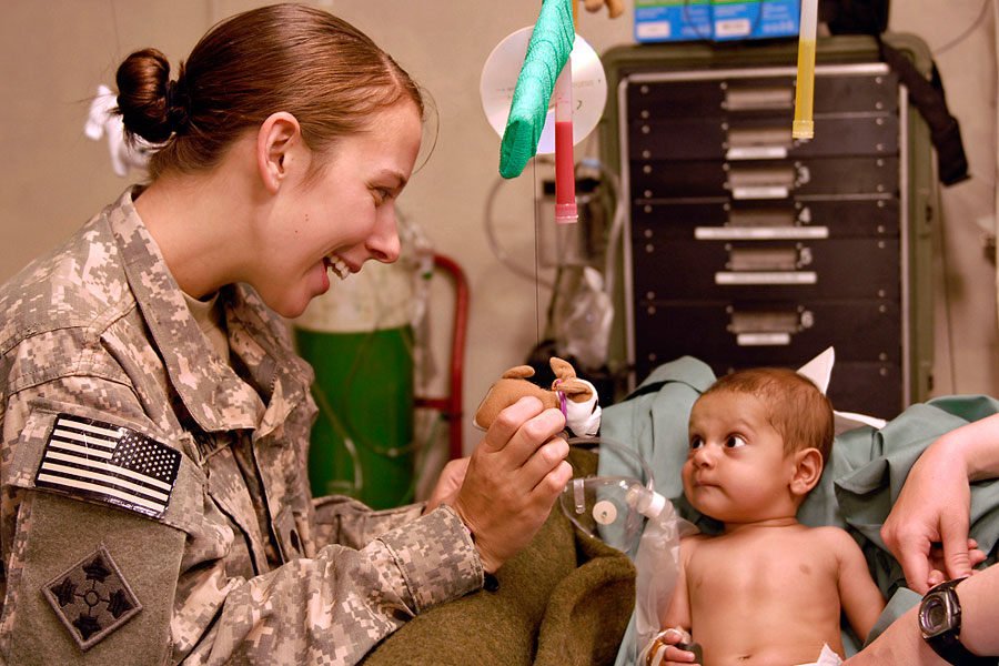 Solider uses Chemlite mobile - Download Hi-Res photoSpc. Samantha Romero, a medic assigned to Headquarters and Headquarters Company, 1st Brigade Combat Team, 4th Infantry Division shows Rafi his new Chemlite mobile, handmade by 'Raider' medics at the Camp Nathan Smith Medical Aid Station in Afghanistan, Sept. 15, 2010. 'Rafi', a 6-month-old Afghan boy, was admitted for complications related to a rare congenital heart defect.