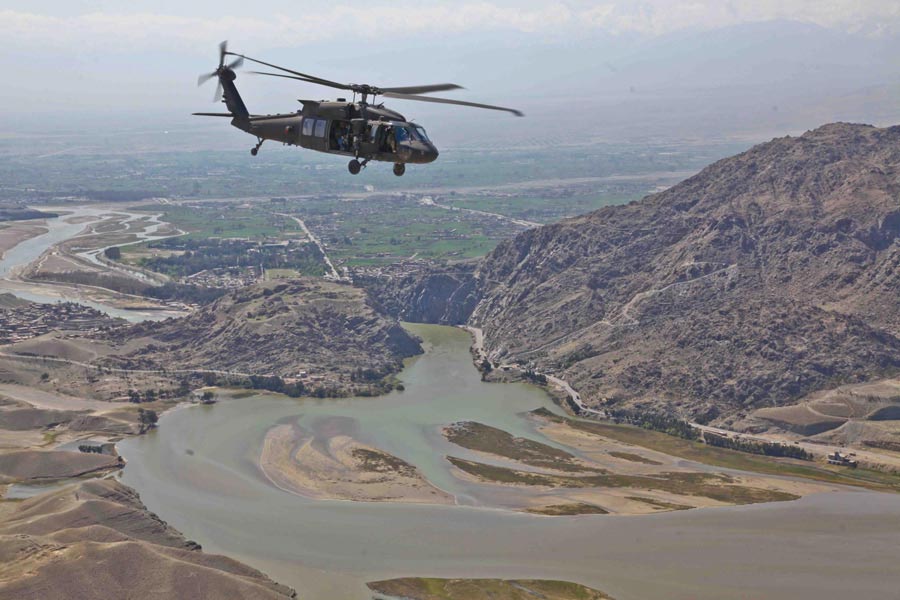 UH-60 Black Hawk Helicopter flys to Forward Operating Base Torkham - Download Hi-Res photoA UH-60 Black Hawk Helicopter flys to Forward Operating Base Torkham, March 28, 2012, in Nangarhar Province, Afghanistan.