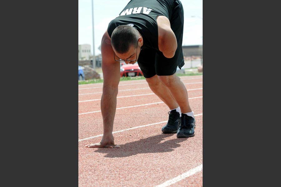 Retired Army Staff Sergeant Michael Kacer, prepares to run laps during track practice at McKibben Physical Fitness Center - Download Hi-Res photoRetired Army Staff Sgt. Michael Kacer, a stay-at-home dad and inspirational speaker, prepares to run laps during track practice at the McKibben Physical Fitness Center at Fort Carson, Colo., April 25, 2012. Kacer, a native of Throop, Pa., sustained injuries in Afghanistan while supporting Operation Enduring Freedom in 2008. Kacer will be competing in the track-and-field and swimming events in the upcoming 2012 Warrior Games, beginning April 30, 2012.