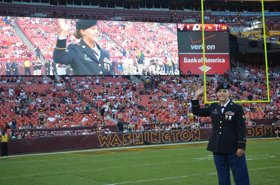 Specialist Casey Work, military police Soldier assigned to 200th Military Police Command, was recognized during Washington Redskins game - Download Hi-Res photoSpc. Casey Work, a Frederick, Md., native and military police Soldier assigned to the 443rd Military Police Company, 400th Military Police Battalion, 200th Military Police Command, was recognized during USAA's Salute to Service Moment at the Washington Redskins vs. Tampa Bay Buccaneers NFL game, Aug. 29, 2012, at FedEx Field in Washington, D.C.