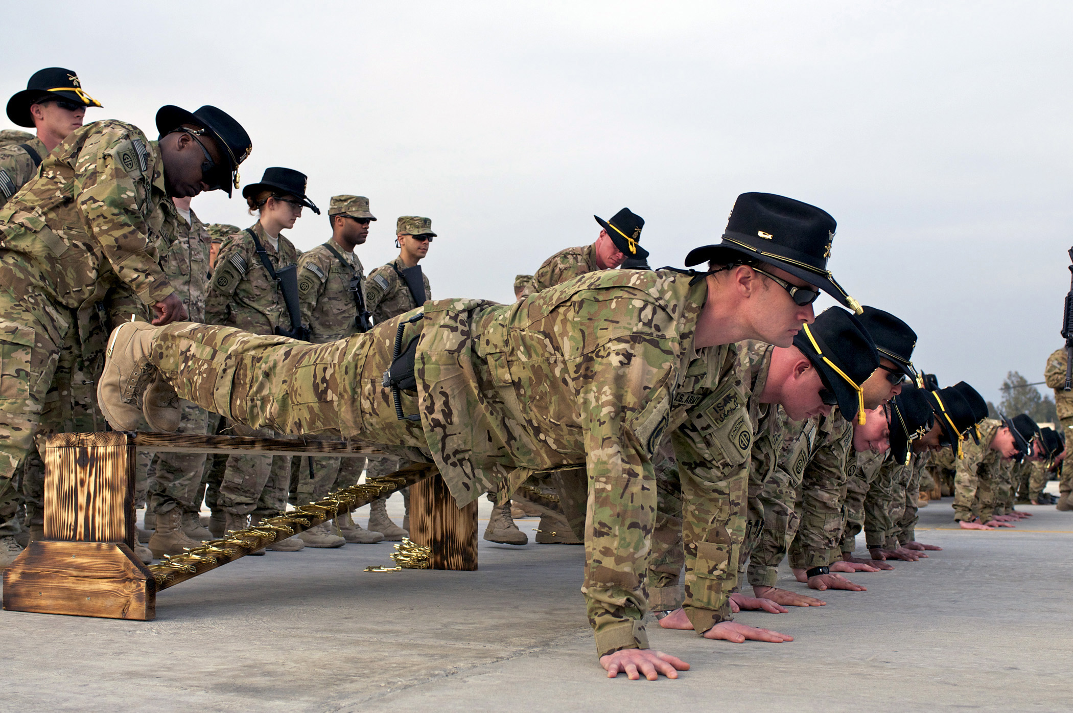 Captain Michael Stackhouse and First Sergeant Christopher Roche, both with Task Force Saber, place gold combat spurs on feet of Troopers - Download Hi-Res photoCapt. Michael Stackhouse, of Lima, Ohio, and 1st Sgt. Christopher Roche, of Alexandria, Va., both with the 82nd Combat Aviation Brigade, Task Force Saber, place gold combat spurs on the feet of Saber Troopers, March 2, 2012. Gold combat spurs are presented to troopers serving more than 30 days in a combat zone with a cavalry unit -- a tradition beginning in the Civil War.