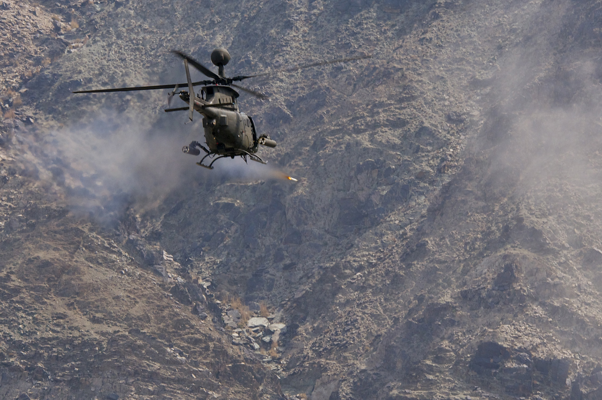 OH-58D Kiowa Warrior from 82nd Combat Aviation Brigade, fires 2.75-inch rocket at mountainside - Download Hi-Res photoAn OH-58D Kiowa Warrior from Task Force Saber, 82nd Combat Aviation Brigade, fires a 2.75-inch rocket at a mountainside during a test flight in eastern Afghanistan, March 2, 2012. The Kiowa warrior is the Army's scout and reconnaissance aircraft, which often provides close support for ground troops on the battlefield. TF Saber's Kiowas lead the 82nd Combat Aviation Brigade, which has flown more than 65,000 hours across all airframes since October 2011.